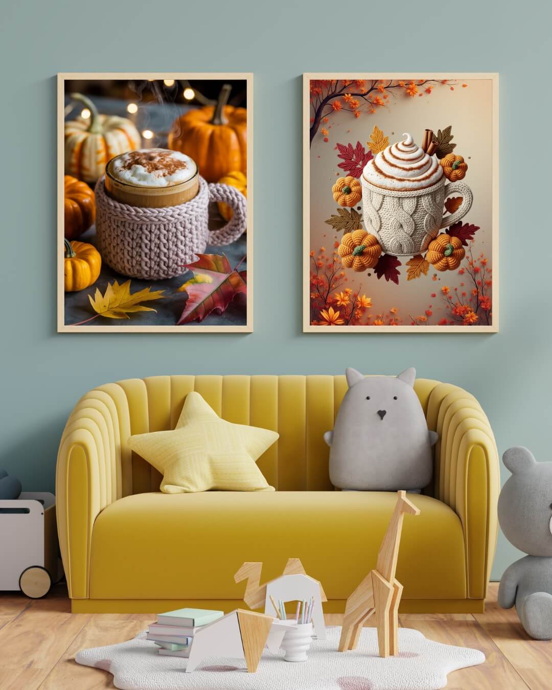 Crochet Wall Art Set of 3 | Coffee Cup, Pumpkin & Tea Cup Prints | Cozy Kitchen Decor | Fall Digital Download | Crochet Lover Gift